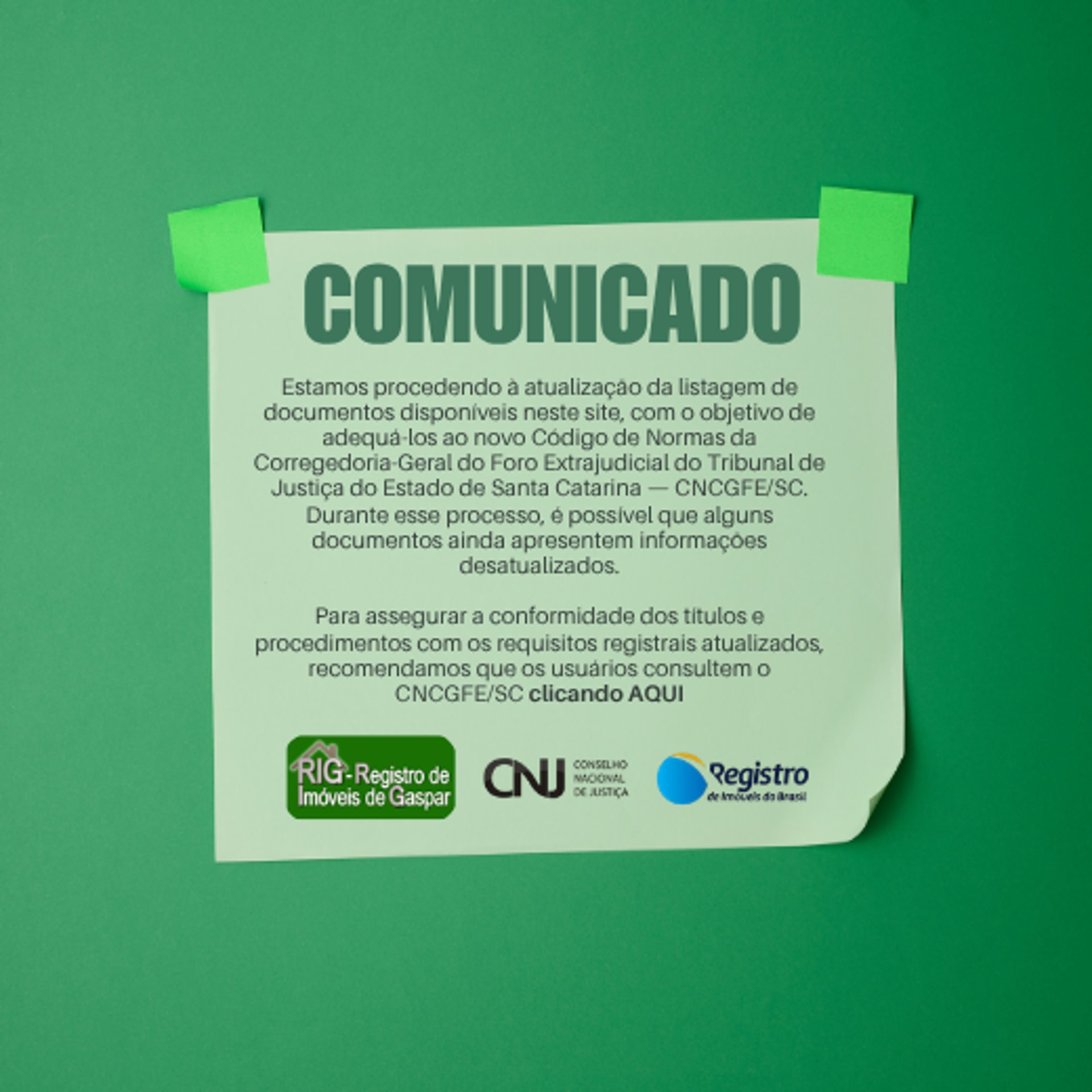 Visando facilitar o acesso às informações relativas ao registro de títulos e pedidos de certidões, foi desenvolvido o site do Registro de Imóveis de Gaspar. Através dessa ferramenta, os usuários poderão visualizar o andamento dos procedimentos de registro (pelo identificador e senha, impressos no recibo de antecipação de emolumentos), a situação do pedido de certidão (para aquelas que não são entregues na hora), solicitar certidões on-line, saber dos principais documentos necessários aos diversos tipos de registro